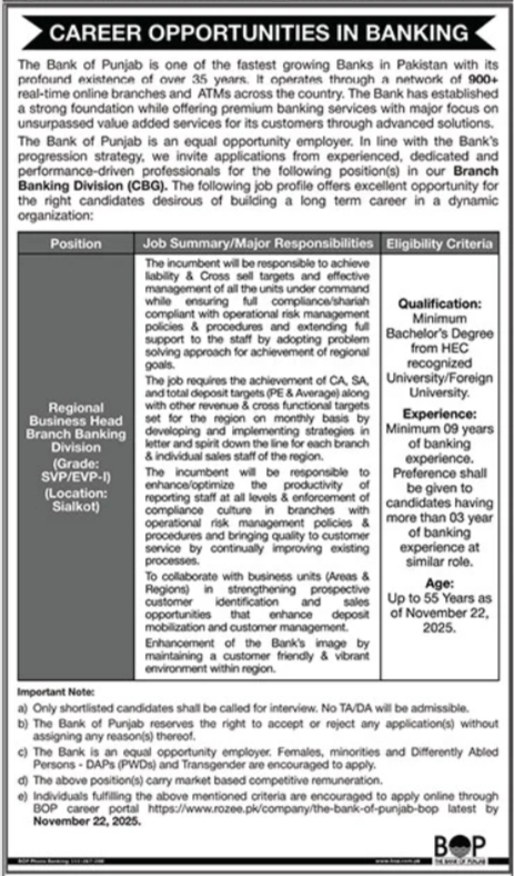 Bank of Punjab BOP Jobs 2025 https://www.bop.com.pk/Apply-Now For Pakistani Male and Female Apply Online. Are you seeking an excellent career opportunity in the government sector in 2025? Bank of Punjab BOP Jobs 2025 Online Apply has announced the latest job openings for the year 2025, providing exciting roles for job seekers across Pakistan.