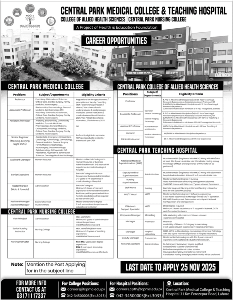| Department | Central Park Medical College & Teaching Hospital Jobs |