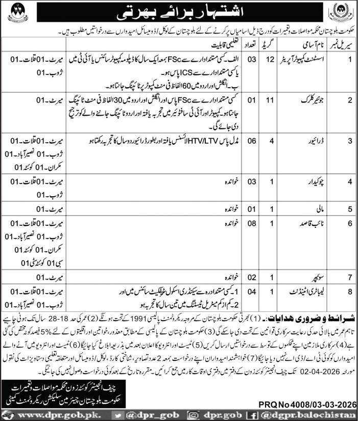 Communication and Works Department Balochistan Jobs 2026 For Pakistani Male and Female Apply Online. Are you seeking an excellent career opportunity in the government sector in 2026? Communication and Works Department Balochistan has announced the latest job openings for the year 2026, providing exciting roles for job seekers across Pakistan. Whether you’re male or female and meet the eligibility criteria, Communication and Works Department offers you the chance to secure a stable and rewarding jobs.