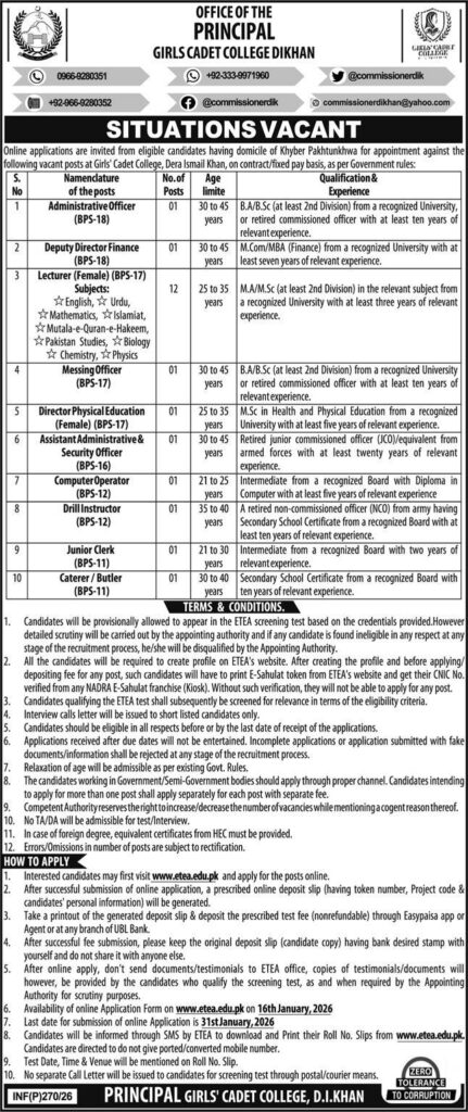 How to Apply for Girls Cadet College DI Khan Jobs 2026