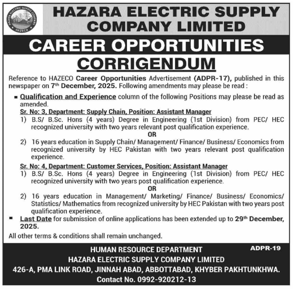 | Department | Hazara Electric Supply Company HAZECO Jobs |