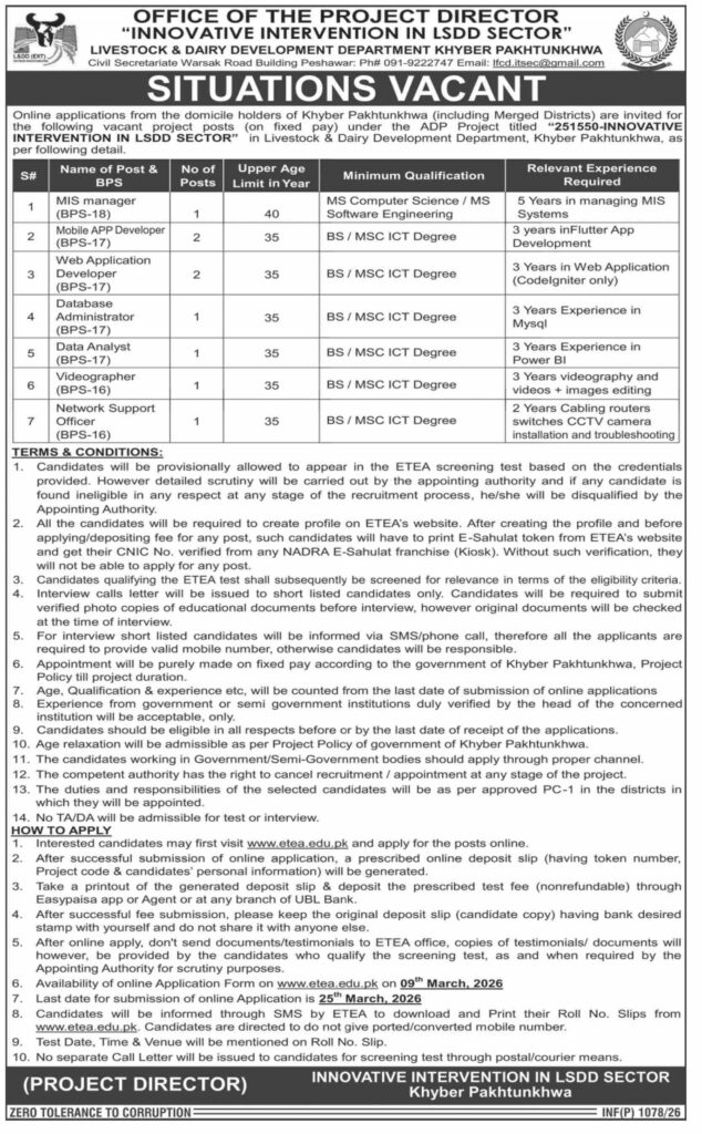 Livestock & Dairy Development Department KPK Jobs 2026 For Pakistani Male and Female Apply Online. Are you seeking an excellent career opportunity in the government sector in 2026? Livestock & Dairy Development Department has announced the latest job openings for the year 2026, providing exciting roles for job seekers across Pakistan. Whether you’re male or female and meet the eligibility criteria, Livestock & Dairy Development Department offers you the chance to secure a stable and rewarding jobs.