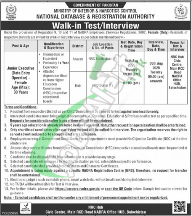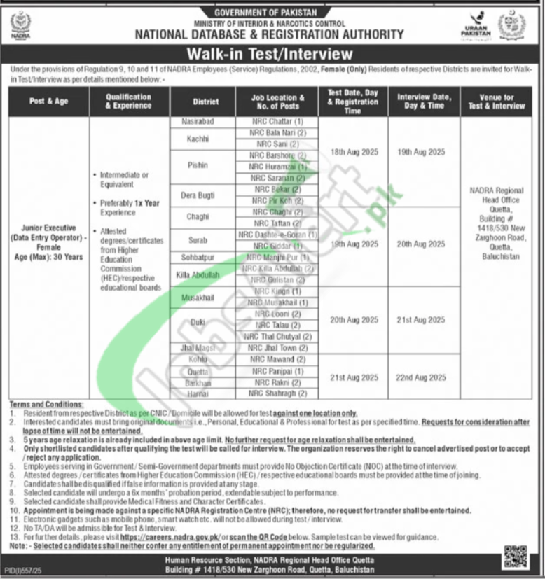 | Department | NADRA Balochistan Walk in Interview Jobs 2025 |