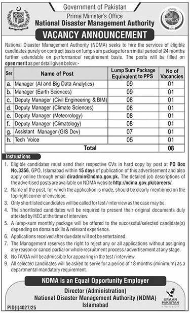 National Disaster Management Authority NDMA Jobs 2025 diradmin@ndma.gov.pk ndma.gov.pk/careers career opportunities For Pakistani Male and Female Apply Online. Are you seeking an excellent career opportunity in the government sector in 2025? National Disaster Management Authority NDMA Jobs 2025 diradmin@ndma.gov.pk ndma.gov.pk/careers career opportunities Online Apply has announced the latest job openings for the year 2025, providing exciting roles for job seekers across Pakistan.