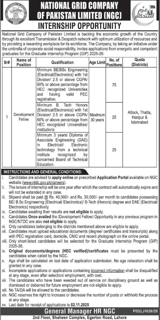 How to Apply for National Grid Company of Pakistan Limited Internship