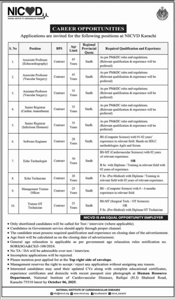 National Institute Of Cardiovascular Diseases NICVD Jobs 2025 For Pakistani Male and Female Apply Online. Are you seeking an excellent career opportunity in the government sector in 2025? National Institute Of Cardiovascular Diseases NICVD Jobs 2025 Online Apply has announced the latest job openings for the year 2025, providing exciting roles for job seekers across Pakistan.