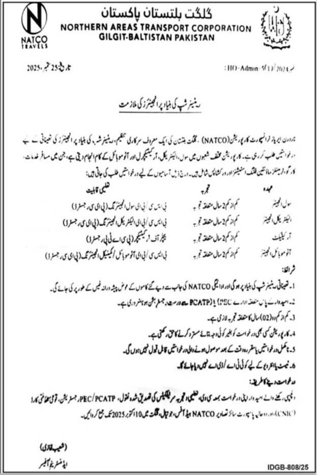 Northern Areas Transport Corporation NATCO Jobs 2025 Advertisement For Pakistani Male and Female Apply Online. Are you seeking an excellent career opportunity in the government sector in 2025? Northern Areas Transport Corporation NATCO Jobs 2025 Online Apply has announced the latest job openings for the year 2025, providing exciting roles for job seekers across Pakistan.