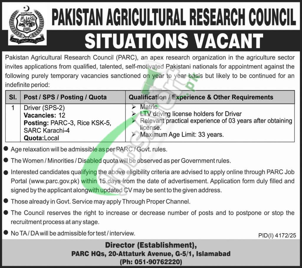 Pakistan Agricultural Research Council PARC Jobs 2025 Online Apply For Pakistani Male and Female Apply Online. Are you seeking an excellent career opportunity in the government sector in 2025? Whether you’re female and meet the eligibility criteria, Pakistan Agricultural Research Council PARC Jobs 2025 Online Apply offers you the chance to secure a stable and rewarding jobs.