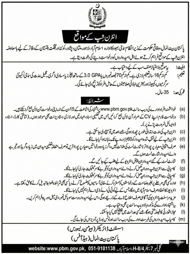 Pakistan Bait Ul Mal PBM Internship Program 2026 Online Apply For Pakistani Male and Female Apply Online. Are you seeking an excellent career opportunity in the government sector in 2026? Pakistan Bait Ul Mal PBM Internship Program 2026 Online Apply has announced the latest job openings for the year 2026, providing exciting roles for job seekers across Pakistan.