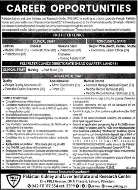 Department | Pakistan Kidney and Liver Institute PKLI Hospital Lahore Jobs 2025 |