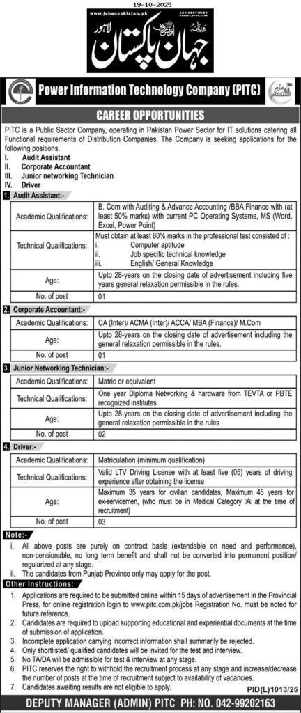 Power Information Technology Company PITC Jobs 2025 Online Apply For Pakistani Male and Female Apply Online. Are you seeking an excellent career opportunity in the government sector in 2025? Whether you’re female and meet the eligibility criteria, Power Information Technology Company PITC Jobs 2025 Online Apply offers you the chance to secure a stable and rewarding jobs.