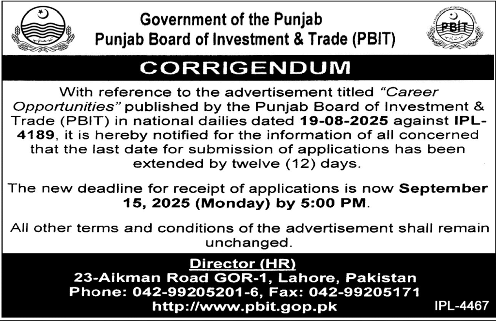 | Department | Punjab Board of Investment & Trade PBIT Jobs |