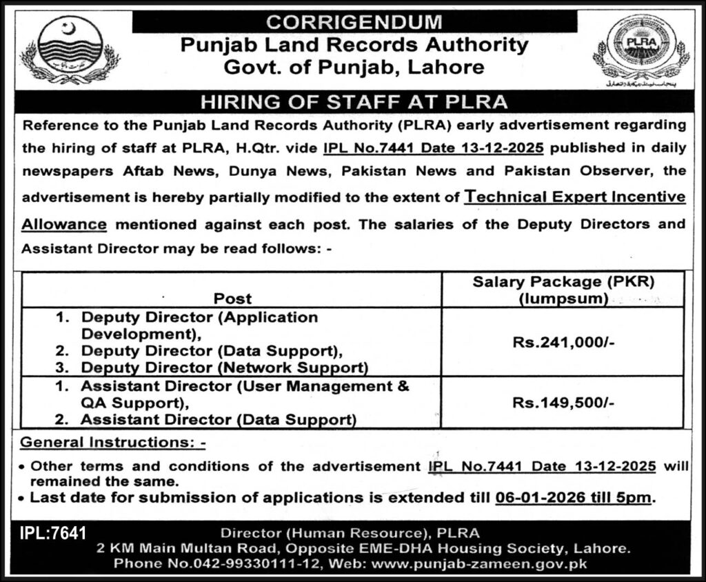 DepartmentPunjab Land Records Authority PLRA Jobs 2026