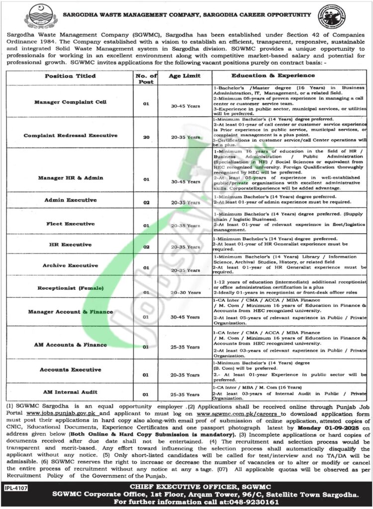 DepartmentSargodha Waste Management Company SWMC Jobs