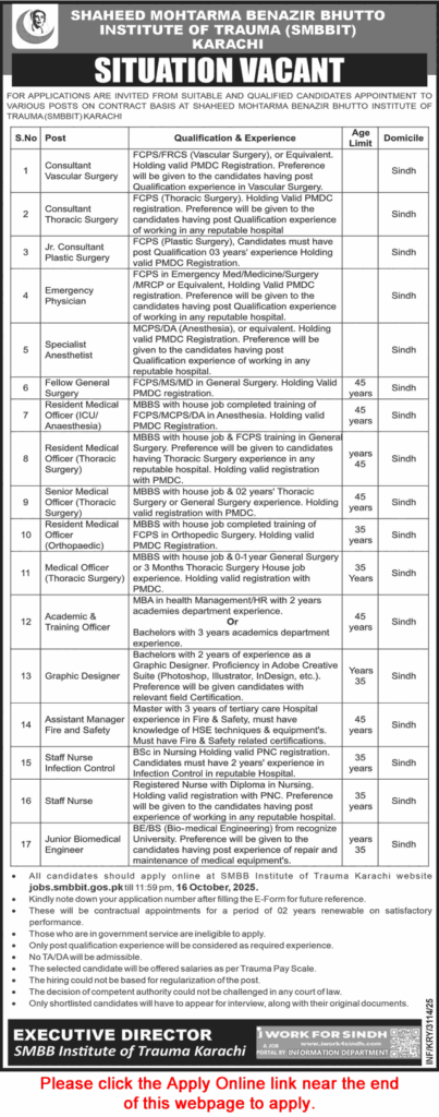 How to Apply for Shaheed Mohtarma Benazir Institute of Trauma SMBBIT Jobs